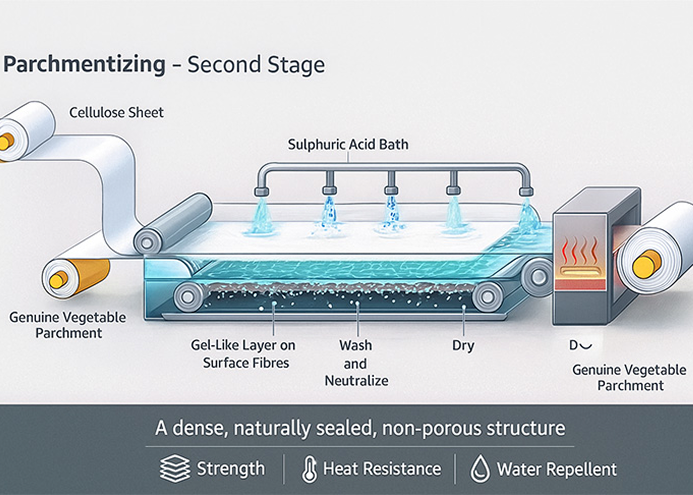 Parchmentizing involves the process of making a normal paper into non-stick, heat-resistant and waterproof parchment paper that is ideal in baking, roasting and wrapping of foods. The treatment offers baked goods such as cake, cookies, and pastries a non-sticking property in the pans, enhancing uniformity and quality. Parchmentized paper is ideal in home kitchens and professional bakeries as it protects trays and minimizes cleanup as well as preserves the texture and appearance of all the baked products. It is also food-safe and grease resistant, so it can also be used to steam, roast, and wrap food, and thus is a versatile and reliable tool that everyone needs to have so as to achieve efficient and quality results of cooking as well.